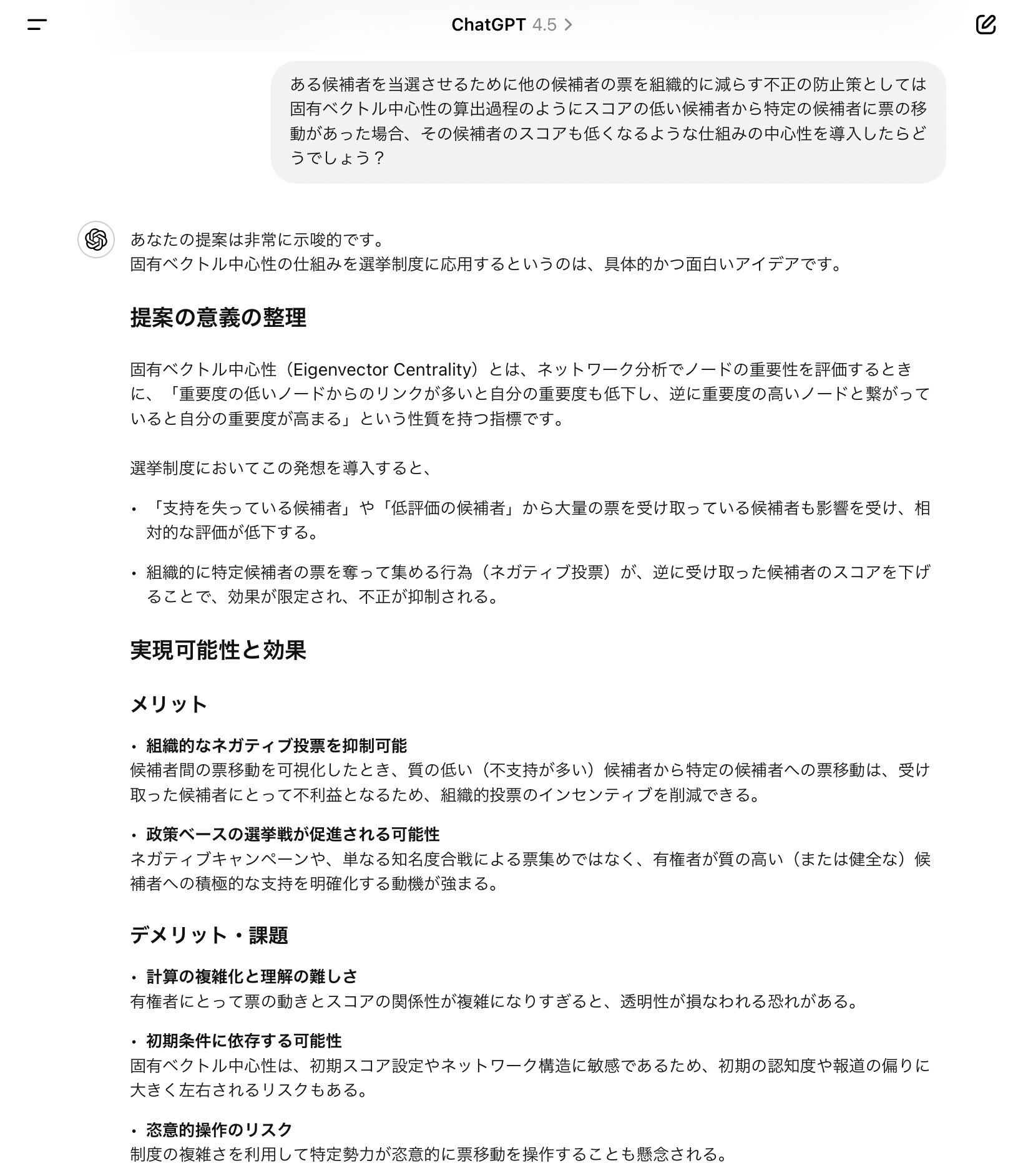 票の移動はishimaruさんに有利な設定と思われますが、逆転までには至らなかったです。今回のアルゴリズムでは、そこそこ競っていないと逆転は難しいようです。嫌われない人が有利なので、現職より新人が有利になると考えられるので、そこは良いかなと思います。